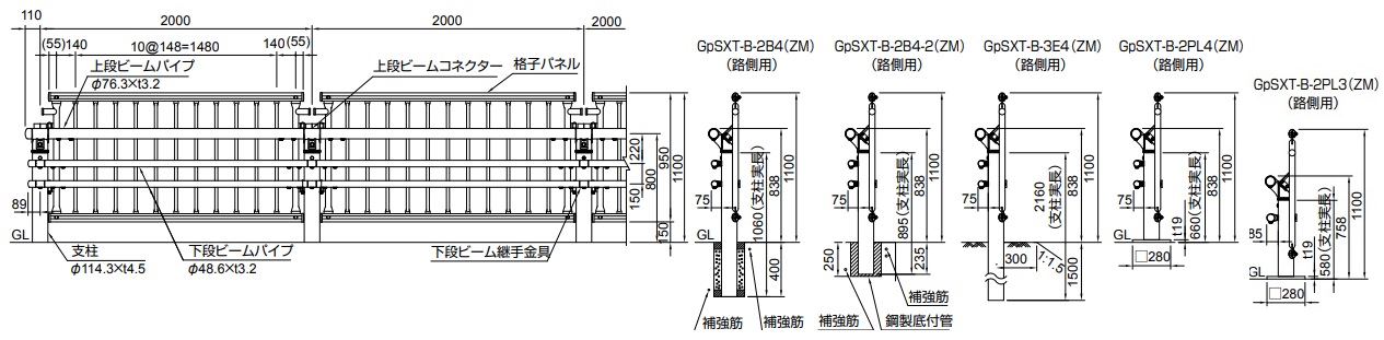 | B種 | 構造物用 | GpSXT-B-2B3-ZM | φ114.3x4.5 | 上段φ76.3x3.2 中・下段φ60.5x3.2 | 2 | 1100 | 400 | 2000 | 41.5 |